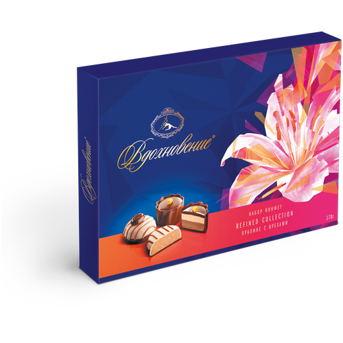 Шоколадные конфеты 'Вдохновение' пралине с орехами — это нежное двухслойное пралине, украшенное апельсиновым цукатом, и пралине с дробленым миндалем, декорированное кофейным зерном. Состав: сахар, молочный шоколад (сахар, какао тертое, масло какао, сухое цельное молоко, эмульгаторы: лецитин соевый, Е476, ароматизатор 'Ванильный'), темный шоколад (сахар, какао тертое, масло какао, эмульгаторы: лецитин соевый, Е476, ароматизатор 'Ваниль'), белый шоколад (сахар, масло какао, сухое цельное молоко, лецитин соевый, Е476, соль поваренная, ароматизаторы 'Ваниль', 'Коньячный'), сухое цельное молоко, ядро ореха миндаля тертое, заменитель молочного жира (рафинированные дезодорированные растительные масла: пальмовое масло, частично гидрогенирированное пальмовое масло, соевое масло, антиокислители: лимонная кислота, аскорбилпальмитат, токоферолы, концентрат смеси, лецитин подсолнечника), масло какао, эквивалент масла какао рафинированные дезодорированные фракционированные, негидрогенизированные растительные масла (пальмовое, ши)), жир специального назначения (растительные негидрогенизированные масла: пальмовое масло, масло ши, эмульгатор лецитин подсолнечника), какао порошок, ядро ореха фундука тертое, ядро ореха миндаля дробленое, сухое обезжиренное молоко, полуфабрикат отделочный 'фруктовые апельсиновые кусочки' фруктовые соки и фрукты (концентрированный апельсиновый сок, яблочное пюре, концентрированный яблочный сок, апельсиновая мякоть), сахар, фруктовый сироп, рисовая мука, масло какао, желирующий агент — пектин, натуральный апельсиновый ароматизатор, регулятор кислотности лимонная кислота), эмульгатор лецитин соевый, ароматизаторы: 'Капучино', 'Кофе', 'Крем-ликер', 'Апельсин'. Противопоказано при непереносимости белка молока. Пищевая ценность на 100 г продукта: белки — 7,4 г, жиры — 36,1 г, углеводы — 50,8 г. Энергетическая ценность на 100 г продукта: 551 ккал. Вес: 170 г. Тип упаковки: картонная коробка. Условия хранения: при температуре от 15 до 21 °С. Страна производства: Россия.