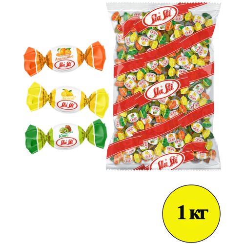 Карамель Мини SlaSti с фруктовой начинкой микс со вкусом апельсин, лимон, киви, 1кг