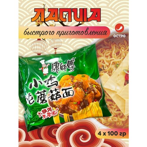 Китайская лапша быстрого приготовления с курицей и грибами упаковка 4 штуки / зеленая