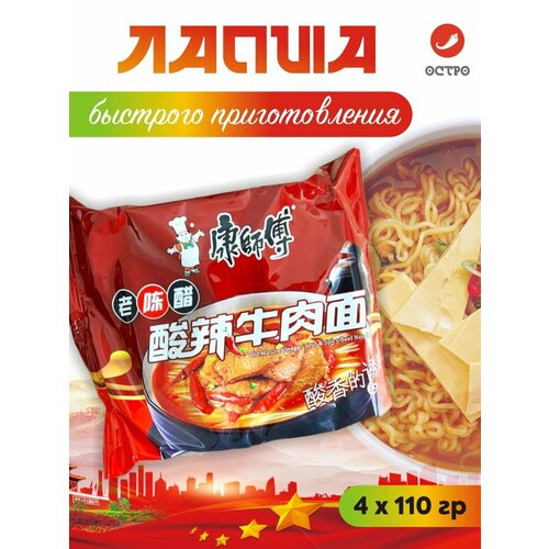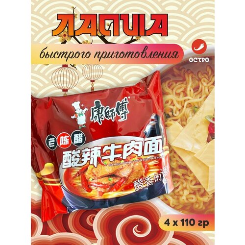 Китайская лапша быстрого приготовления кисло-острая с говядиной упаковка 4 шт / коричневая
