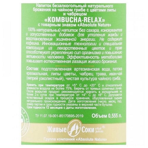 Комбуча Absolute Nature "Kombucha-Relax" без сахара с цветами липы и чабрецом 0.555 л.