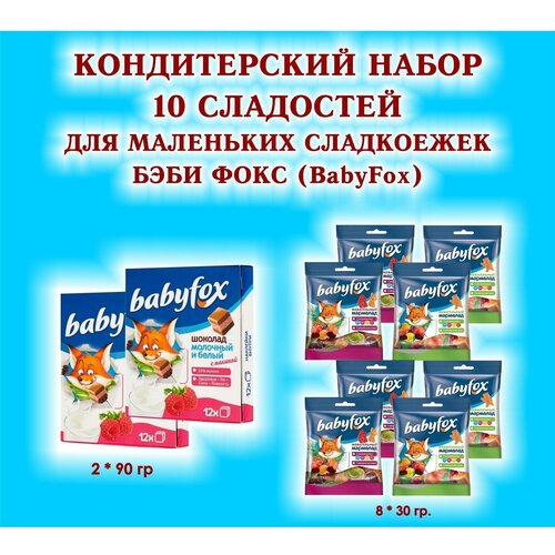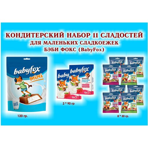 Набор сладостей "BabyFox" Шоколад мол. с малиной 2*90 гр.+ Мармелад жевательный 8*30 гр.+ Конфеты с мол. начинкой 1*120 гр.-детский подарок
