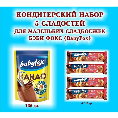 Набор сладостей"BabyFox"-Батончик вафельный шок-орех"ROXY"4*18 гр.+какао 1*135 гр.-подарок для маленьких сладкоежек