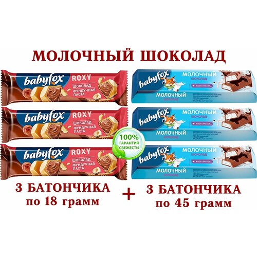 Шоколадный батончик "BabyFox" микс- Вафельный шоколадно-ореховый "ROXY" + C молочной НАЧИНКОЙ-3 шт.* 45 гр.+3 шт.* 18 гр.