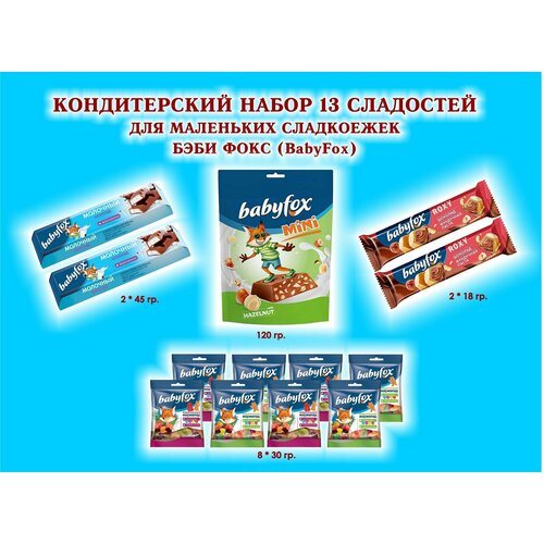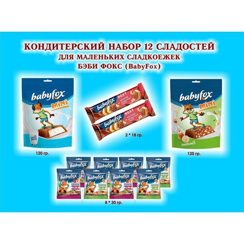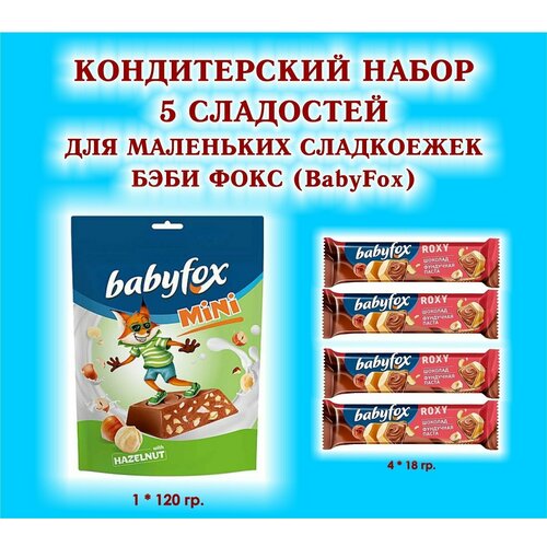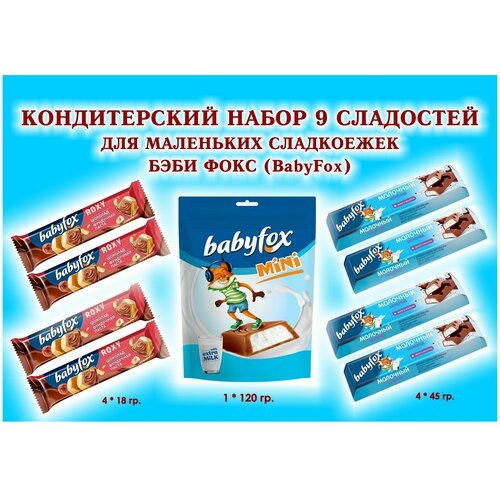 Набор сладостей"BabyFox"-Батончик с молочной начинкой 4*45 гр.+Батончик вафельный ROXY 4*18 гр.+Конфеты c молочной начинкой 1*120 гр.-детский подарок