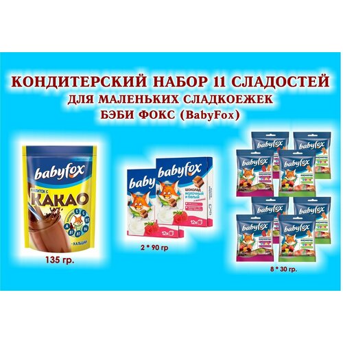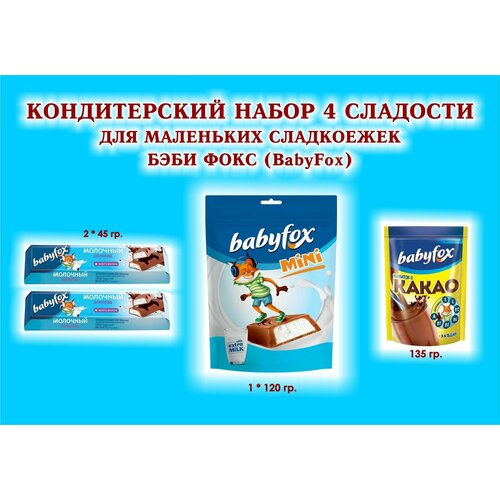 Набор сладостей"BabyFox"- какао 1*135 гр.+ Батончики с молочной начинкой 2*45 гр.+ Конфеты с молочной начинкой 1*120 гр. — детский подарок