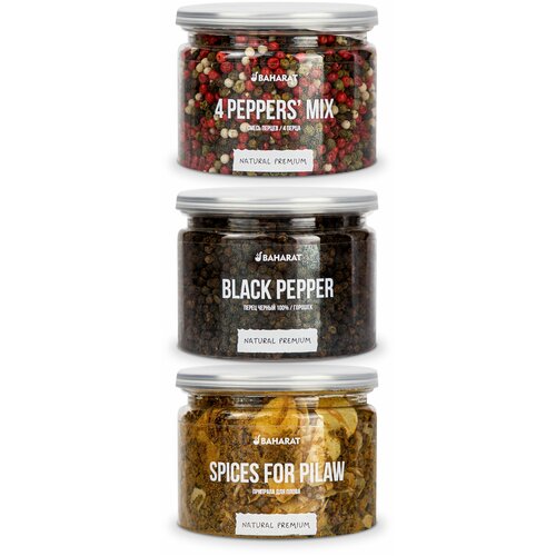 Набор из 3-х приправ BAHARAT смесь перцев 4 перца 145 гр, чёрный перец горошек 160 гр, приправа для плова 100, универсальная специя и приправа
