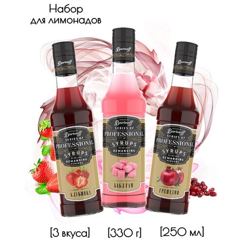Набор сиропов Barinoff для кофе и коктейлей Бабл Гам, Клубника, Гренадин (3 шт по 330 г)