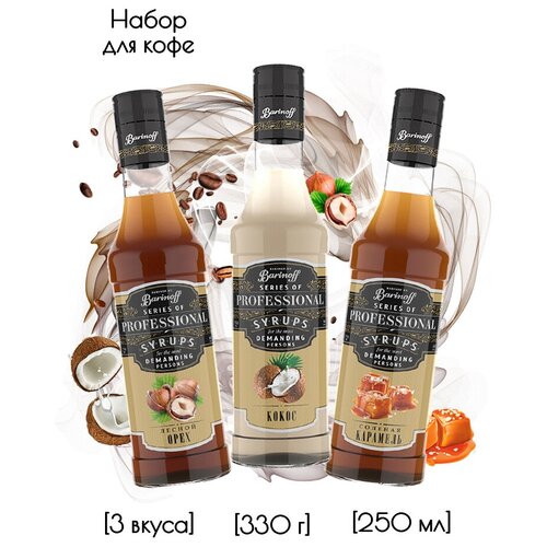 Набор сиропов Barinoff для кофе и коктейлей Кокос,Лесной Орех, Соленая Карамель (3 шт по 330 г)