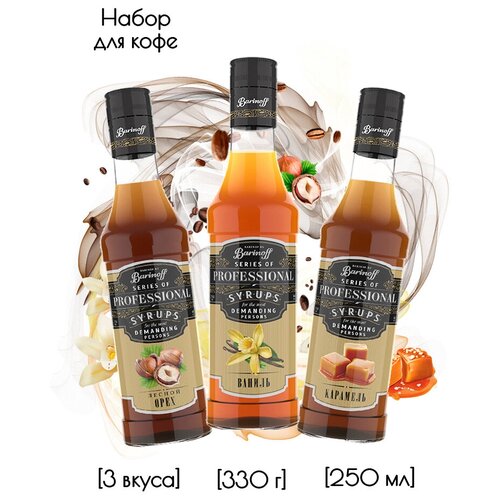 Набор сиропов Barinoff для кофе и коктейлей Лесной Орех, Ваниль, Карамель (3 шт по 330 г)