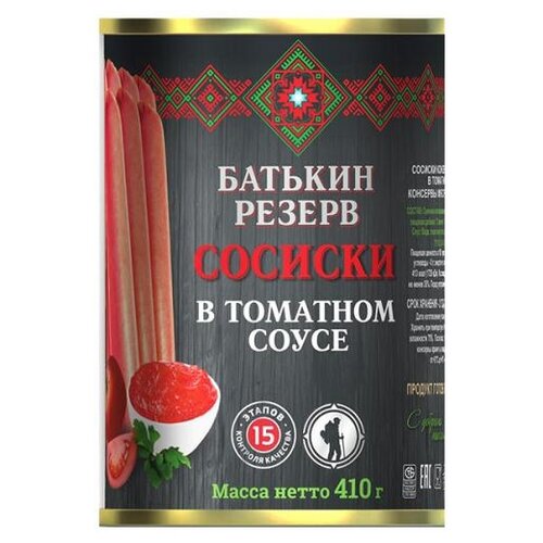 Сосиски консервированные в томатном соусе, Батькин резерв, ТУ, 15 шт. по 410 г