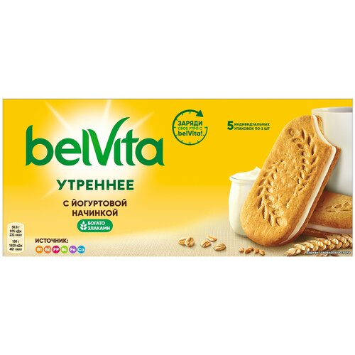 Belvita утреннее Печенье Сэндвич с йогуртовой начинкой витаминизированное с цельными злаками и йогуртовой начинкой, 5 индивидуальных упаковок 253г