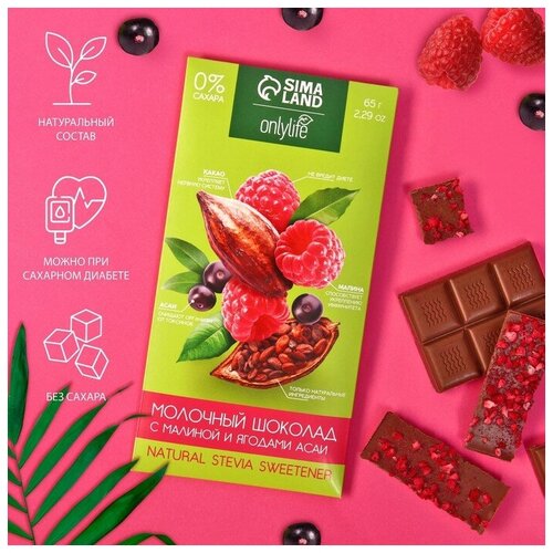 Молочный шоколад Onlylife с малиной и ягодами асаи, без сахара, 65 г.