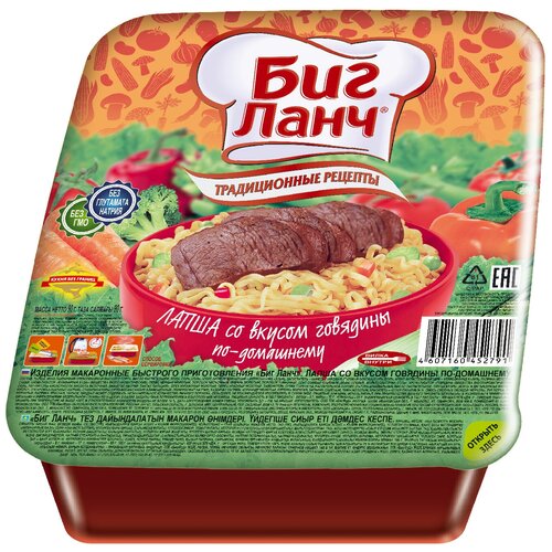 Лапша быстрого приготовления Биг Ланч Лоток традиционные рецепты со вкусом говядины 90г х 8шт