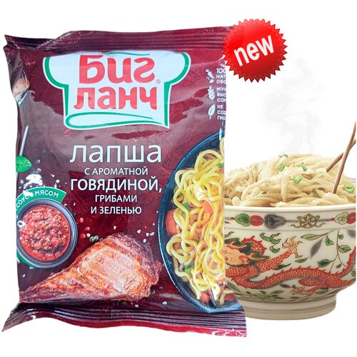Лапша быстрого приготовления Биг Ланч с ароматной говядиной, грибами и зелень 1 коробка 60 шт