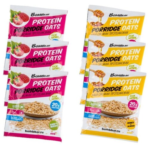 BombBar Овсяная каша быстрого приготовления с белком (пакет), ассорти Мед/Малина, 6шт. Х 60гр.