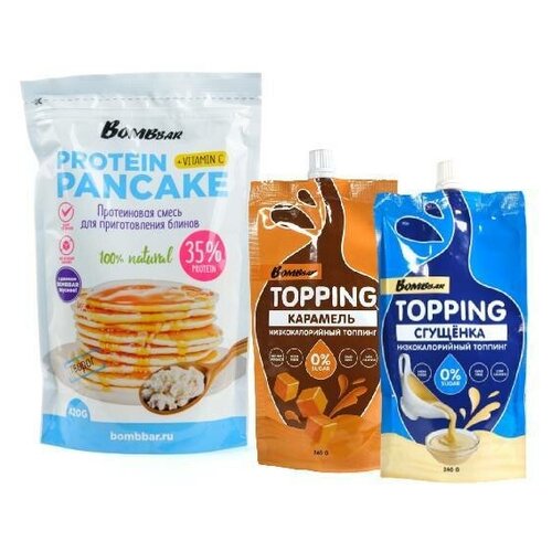 Микс для завтрака BOMBBAR: смесь для приготовления блинов и панкейков с творогом, топпинг карамель, сгущенка