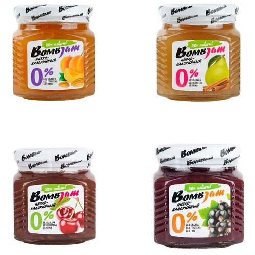 Низкокалорийный джем Bombbar , Микс 4 шт (Абрикос-миндаль, Груша-корица, Вишня, Черная смородина)
