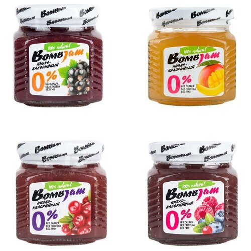 Низкокалорийный джем Bombbar , Микс 4 шт (Черная смородина, Манго-банан, Брусника, Лесная ягода)