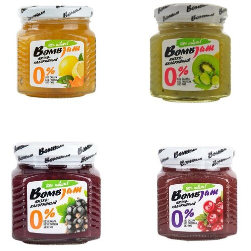 Низкокалорийный джем Bombbar , Микс 4 шт (Облепиха-лимон, Киви-крыжовник, Черная смородина, Брусника)