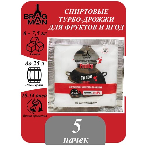 Спиртовые турбо дрожжи Bragman Fruity для фруктовых браг (5 пачек) / дрожжи для кальвадоса, коньяка, чачи/ дрожжи Брагман Фрут/ 60 гр