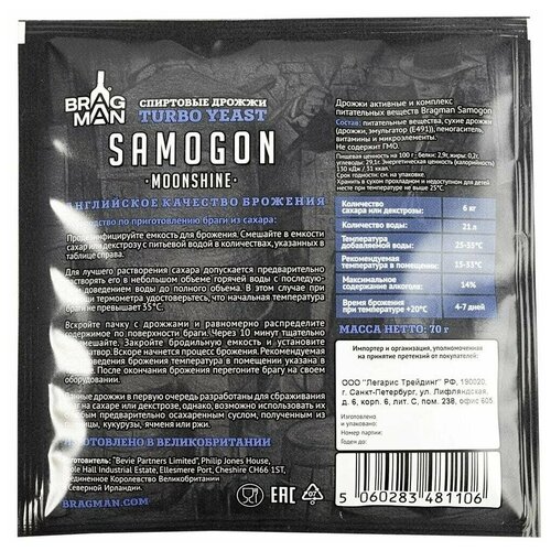 Турбо дрожжи Bragman Samogon 70гр. — 5 пачек
