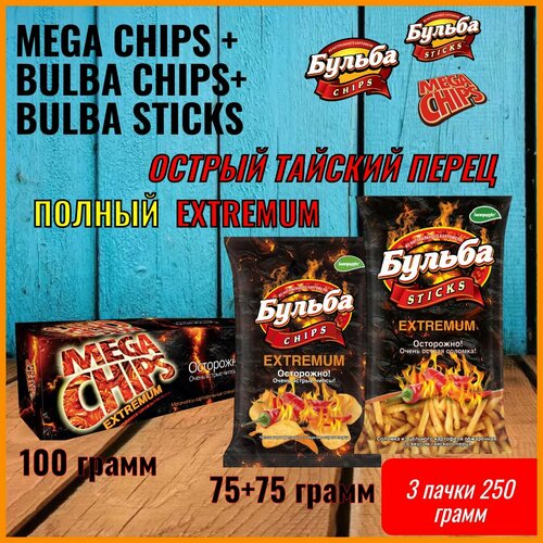 Набор очень острых снеков. (250 грамм) чипсы Бульба CHIPS + соломка Бульба STICKS + чипсы Mega Chips Острые с тайским перцем