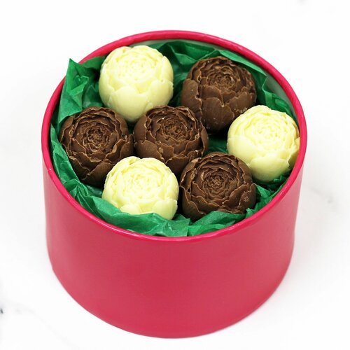 Шоколадный букет пионов в коробке 7 шт. "Фуксия", белые и коричневые цветы, съедобный сладкий подарок
