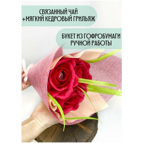 Букет из чая и конфет: Розы из гофробумаги, связанный чай, мягкий грильяж