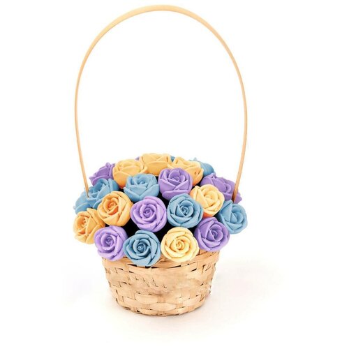 33 шоколадные розы CHOCO STORY в корзинке — Голубой, Розовый и Фиолетовый микс из Бельгийского шоколада, 396 гр. K33-GRF
