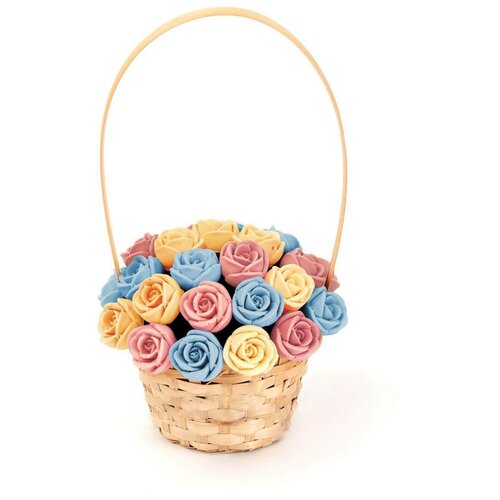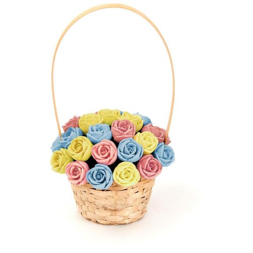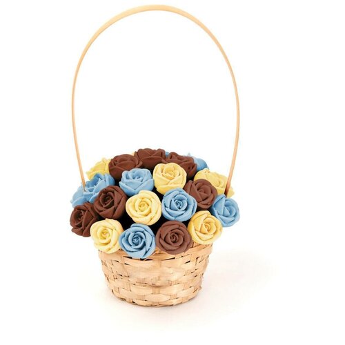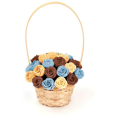 33 шоколадные розы CHOCO STORY в корзинке — Голубой, Желтый и Розовый микс из Бельгийского шоколада, 396 гр. K33-GJR