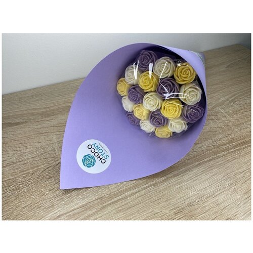Подарочный набор конфет: Шоколадный букет из 19 розочек CHOCO STORY, в Сиреневой подарочной бумаге: Белый, Желтый и Фиолетовый Бельгийский шоколад, 228 гр., B19-C-BFJ