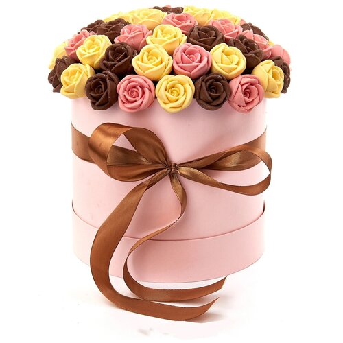 Розы из шоколада 101 шт. CHOCO STORY в Розовой Шляпной коробке: Желтый, Розовый и Коричневый Бельгийский шоколад, 1212 гр. SH101-R-JRSH