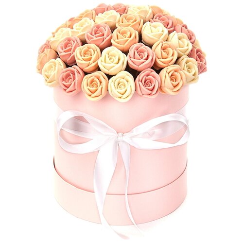 Розы из шоколада 101 шт. CHOCO STORY в Розовой Шляпной коробке: Белый, Оранжевый и Розовый Бельгийский шоколад, 1212 гр. SH101-R-BOR