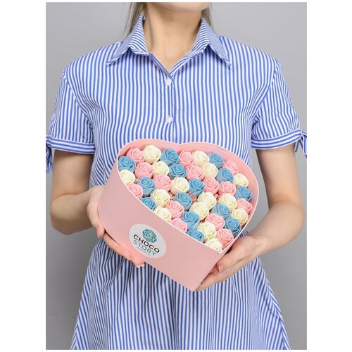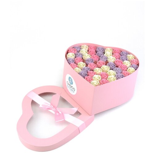 Подарочный набор конфет: 43 шоколадные розы в форме сердца CHOCO STORY Розовый, Белый Бельгийский шоколад: Белый, Голубой и Розовый, 516 гр. ZS43-R-BGR