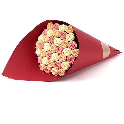 Шоколадный букет из 37 розочек CHOCO STORY, в Красной подарочной обертке: Оранжевый, Белый и Розовый микс Бельгийского шоколада, 444 гр. B37-K-OBR