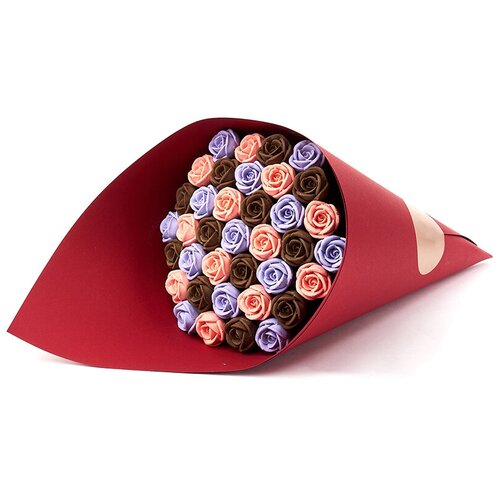 Шоколадный букет из 37 розочек CHOCO STORY, в Красной подарочной обертке: Фиолетовый, Розовый и Шоколадный микс Бельгийского шоколада, 444 гр., B37-K-FRSH