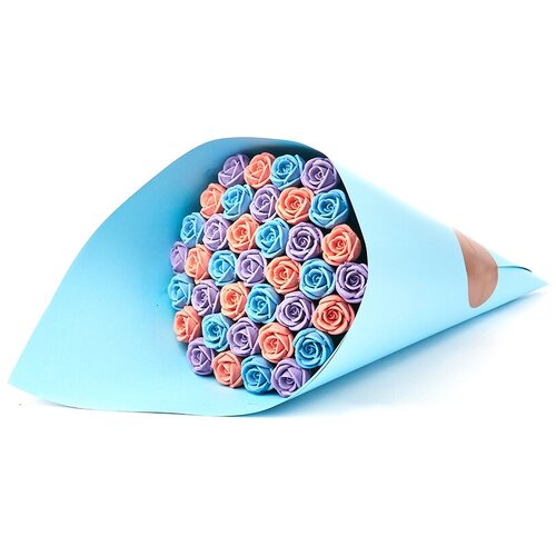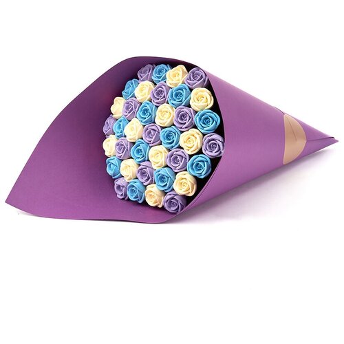 Шоколадный букет из 37 розочек CHOCO STORY, в Голубой подарочной обертке: Фиолетовый, Розовый и Голубой микс Бельгийского шоколада, 444 гр., B37-G-FRG
