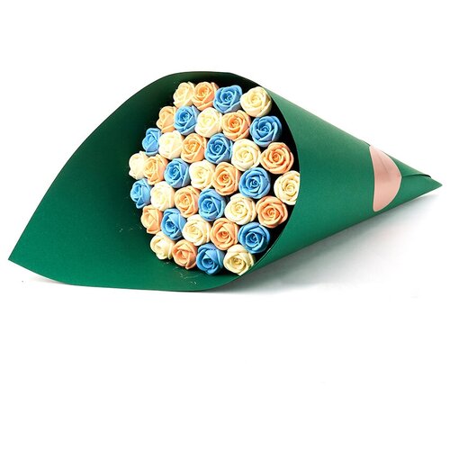 Шоколадный букет из 37 роз CHOCO STORY, в Зеленой подарочной обертке: Белый, Оранжевый и Голубой микс Бельгийского шоколада, 444 гр., B37-Z-BOG