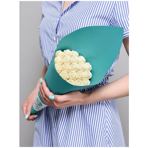 Шоколадный букет из 19 розочек CHOCO STORY, в подарочной бумаге цвета Аквамарин: Белый Бельгийский шоколад, 228 гр., B19-A-B