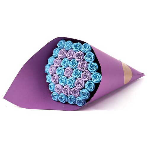 Шоколадный букет из 37 розочек CHOCO STORY, в Фиолетовой подарочной бумаге: Фиолетовый и Голубой Бельгийский шоколад с узором круглешок, 444 гр. B37-F-FG-O