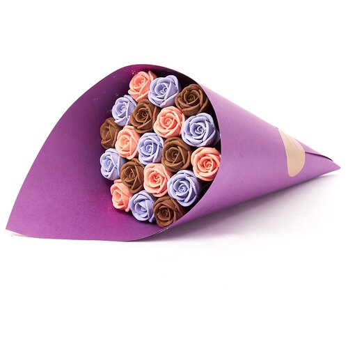 Шоколадный букет из 19 розочек CHOCO STORY, в Фиолетовой подарочной бумаге: Фиолетовый, Розовый и Молочный Бельгийский шоколад, 228 гр. B19-F-FRSH