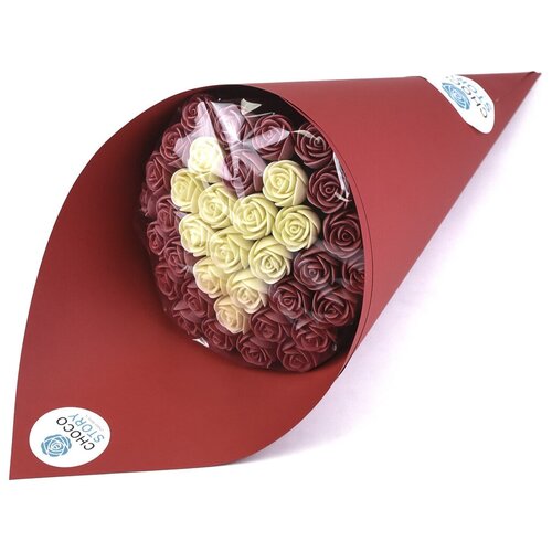 Шоколадный букет из 37 розочек CHOCO STORY, в Красной подарочной бумаге, узор Сердце — Белый и Красный Бельгийский шоколад, 444 гр. B37-K-BK-S