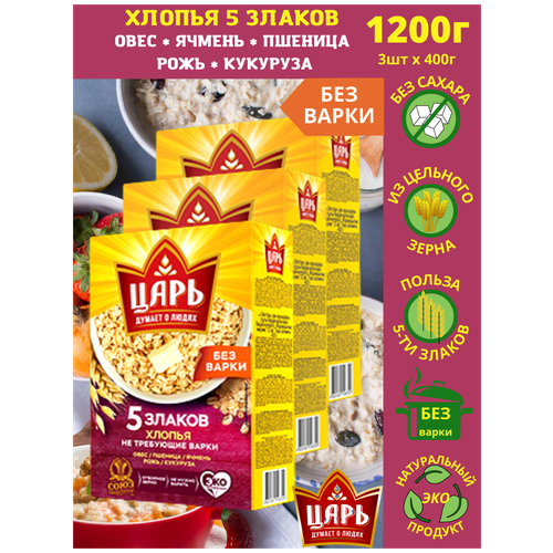 Набор Хлопья многозерновые Царь из 5-ти злаков не требующие варки 400г. Каша моментального приготовления. 3шт.