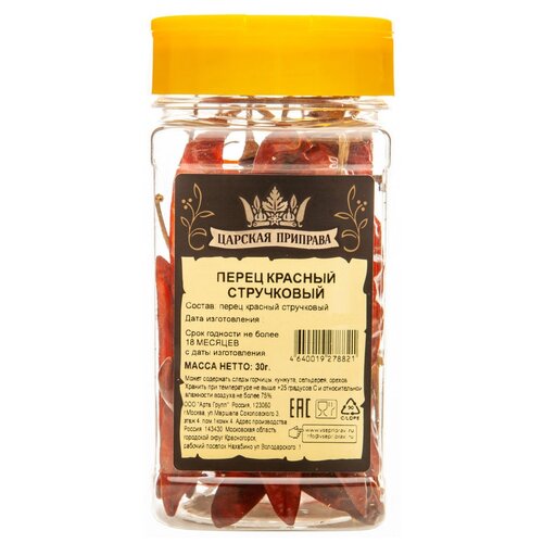Перец красный стручковый острый натуральный Царская приправа 30 г, целый