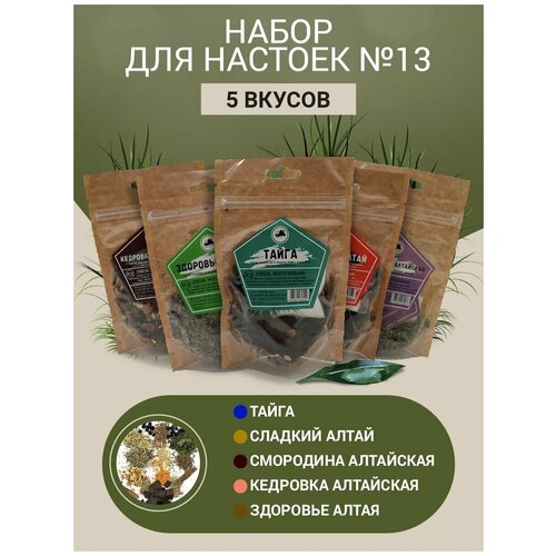 Комплект №13 наборов для настойки Дед Алтай, 5 вкусов: Здоровье, Кедровка, Сладкий Алтай, Смородина, Тайга