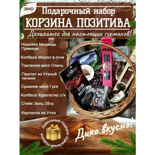 Подарочный набор "Корзина позитива" (заяц, медведь, гусь, куропатка, утка, марал) вяленое, сушеное мясо