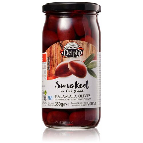Маслины Каламата с косточкой копченые на дубовых опилках, в рассоле, Delphi 350 г.