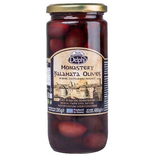 Маслины Каламата с/к в рассоле Монастырские DELPHI 480 г ст/б DELPHI MONASTERY — BLACK NATURAL WHOLE OLIVES (KALAMATA TYPE — THIRD COUNTRY ORIGIN) IN JARS 500ML 285 GR, JUMBO
