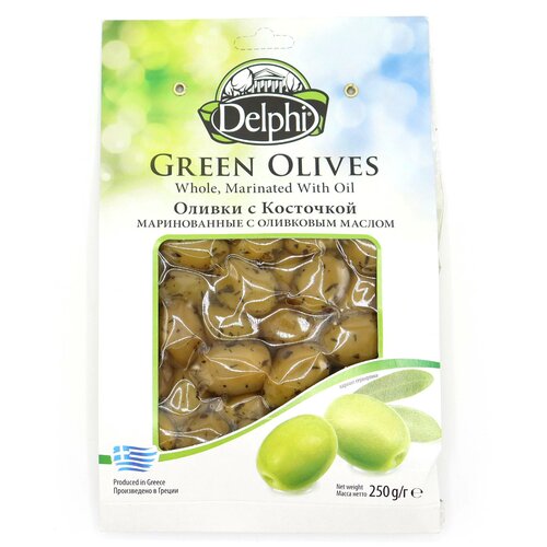 Оливки DELPHI с косточкой маринованные с оливковым маслом, 250г.